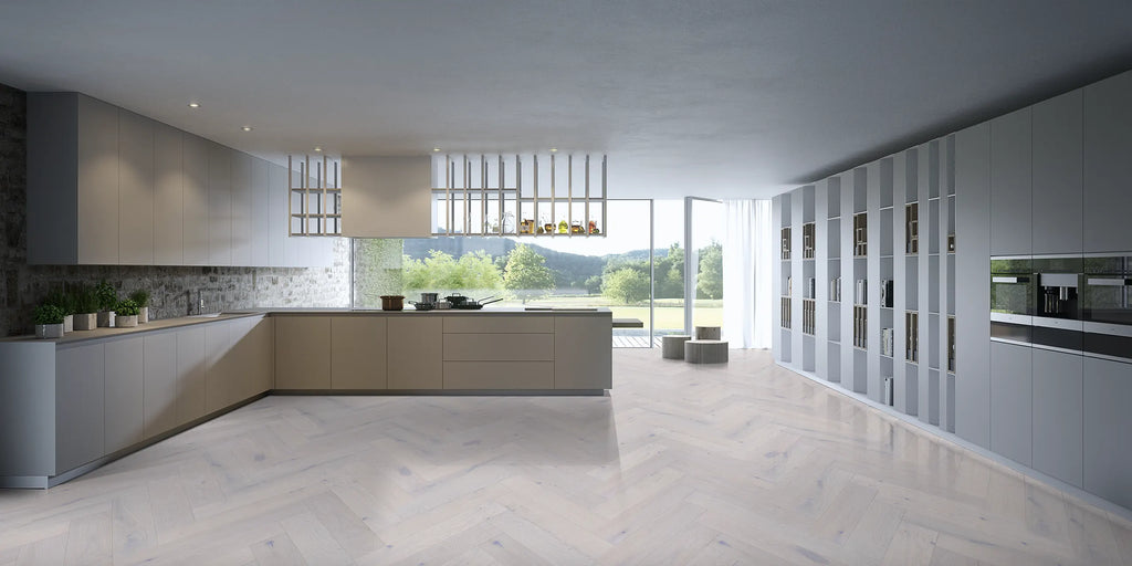 Sirocco —Inspired by the warm wind found in the Aegean Sea, Sirocco is a raw visual, in which the Mediterranean sun washed out the color to a luminous soft white. We avoid the pinks and yellows of lesser pale floors, making it the perfect white tone.