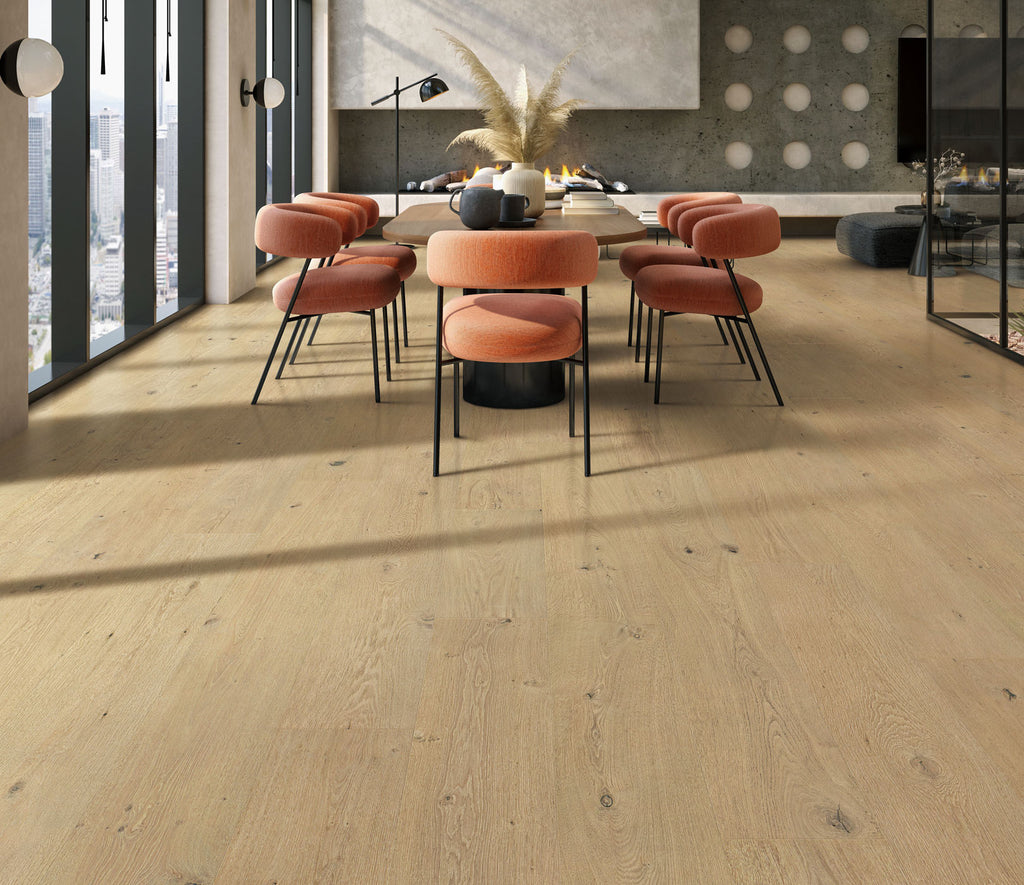 The new Vitali Elite Collection collection is an ultra-wide, long plank luxury European hardwood featuring a light wire brush, multi-layered stain with color variation, in a range of contemporary colors designed for a clean, modern interior visual.